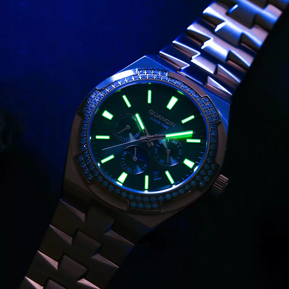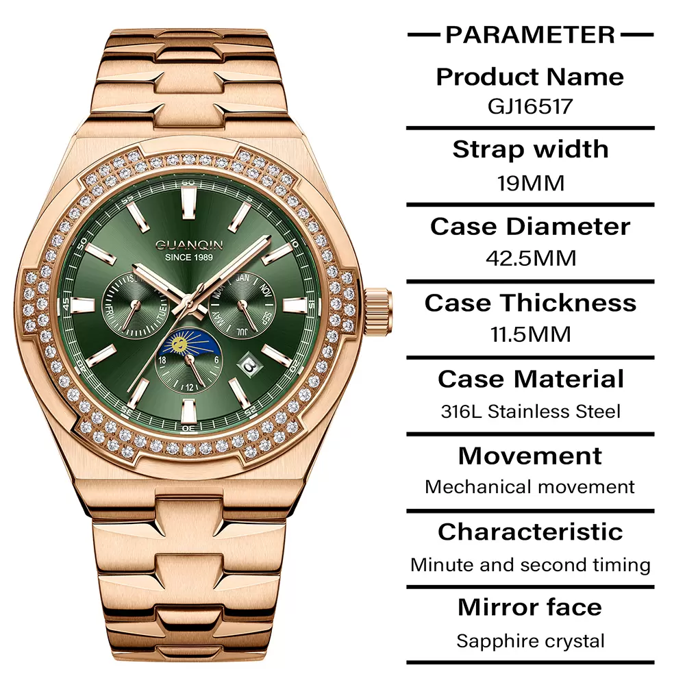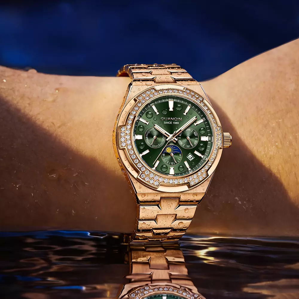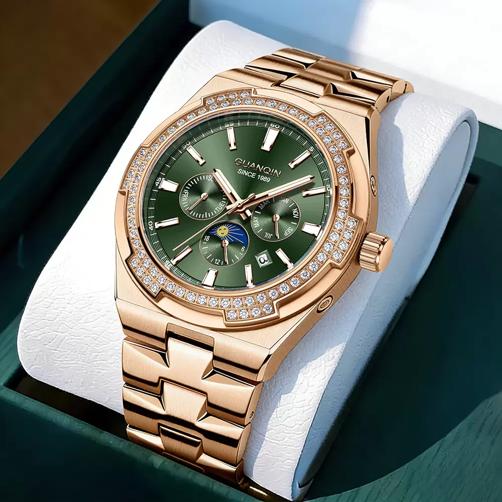 OEM/ODM Available 2026 New Arrival. Featuring a stunning emerald green sunburst dial, sparkling diamond bezel, and solid rose gold-tone stainless steel bracelet. This timepiece combines moon phase, date window, and chronograph functions for elegant versatility. Personalize it! Offer custom dial colors, strap material options, and engraved logo services. Ideal for business occasions & gifting. Top quality supplier for Amazon, Shopee & independent stores. High-res images & drop shipping supported.
