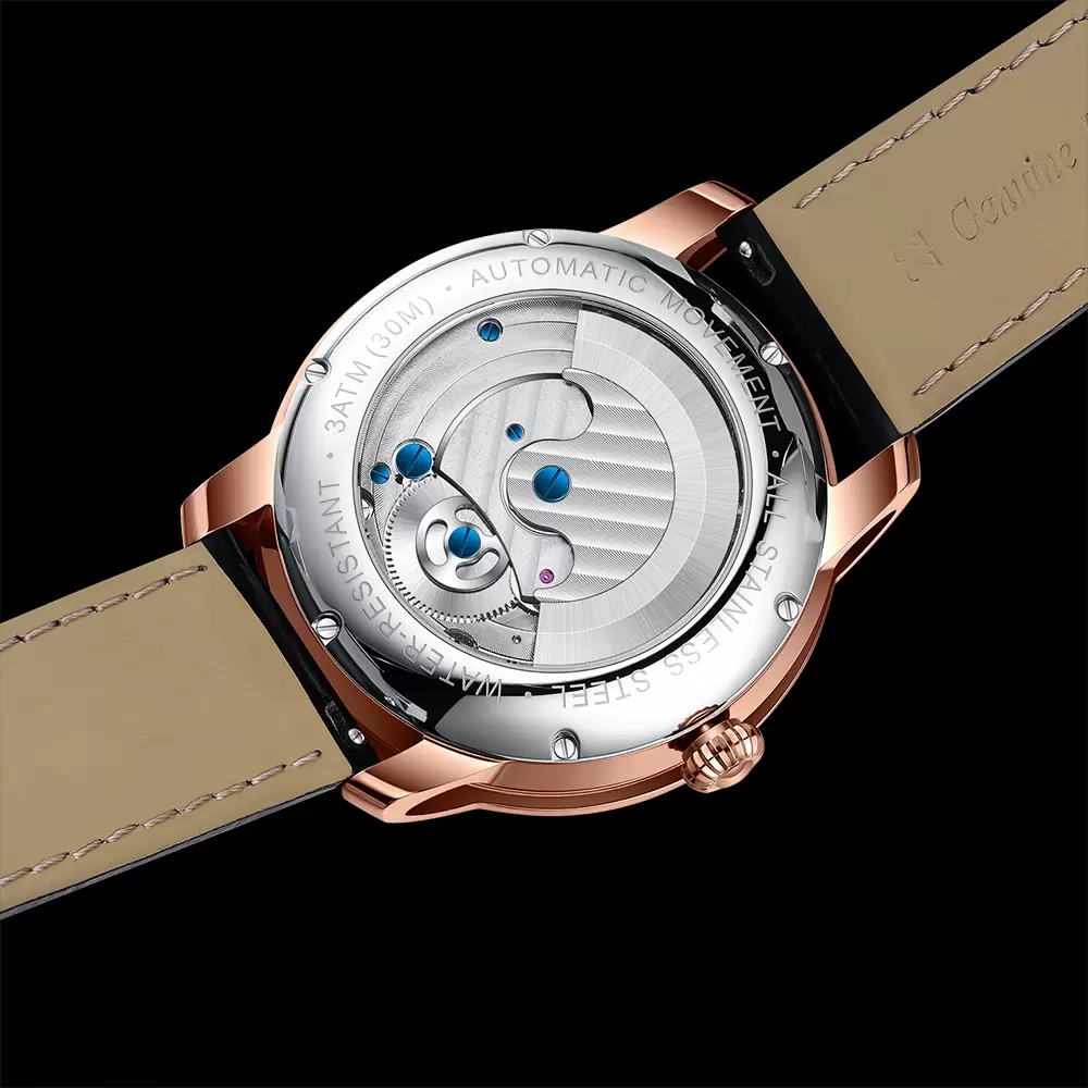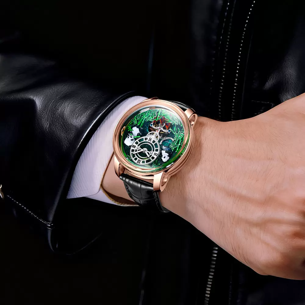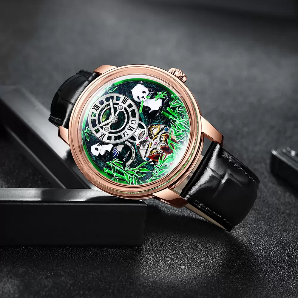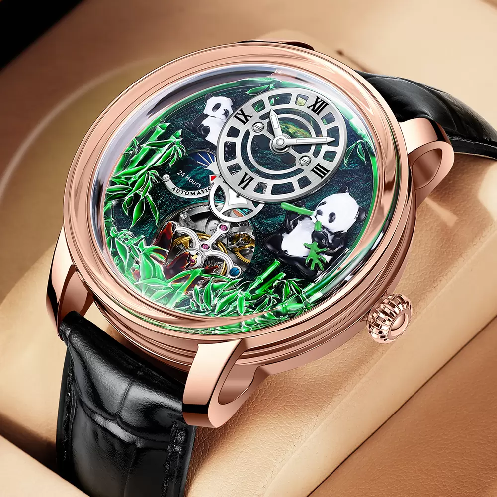 Wear the iconic Chinese national treasure! This exquisite mechanical watch features an embossed panda & bamboo dial, hollow movement and 24-hour display, showcasing stunning Oriental charm. The rose gold case with a black crocodile-pattern leather strap exudes premium luxury, perfect for business and gifting.