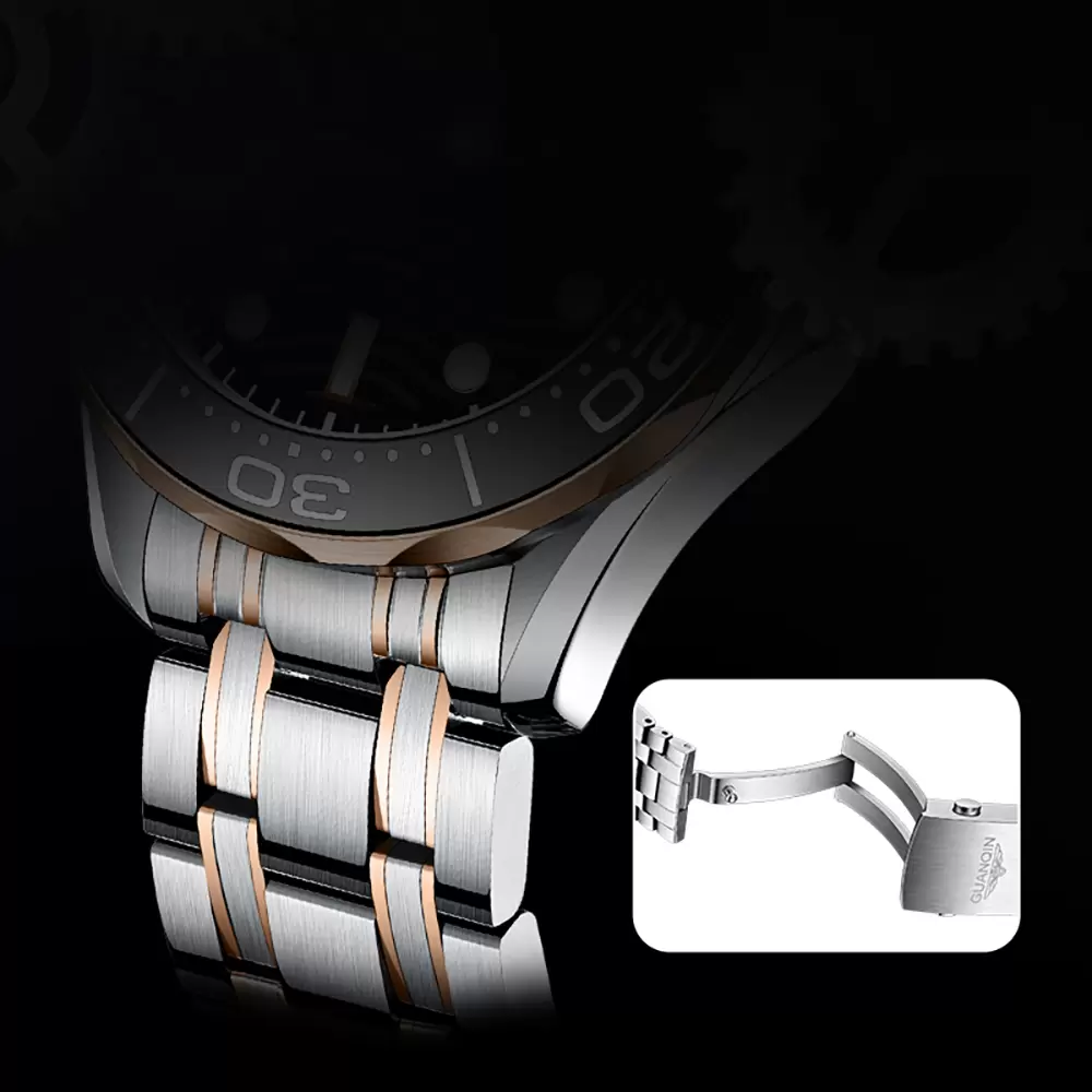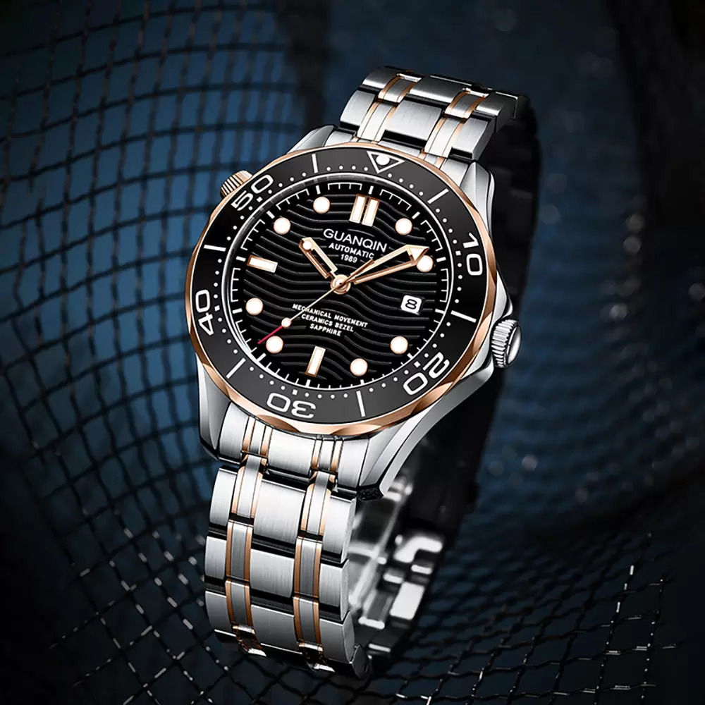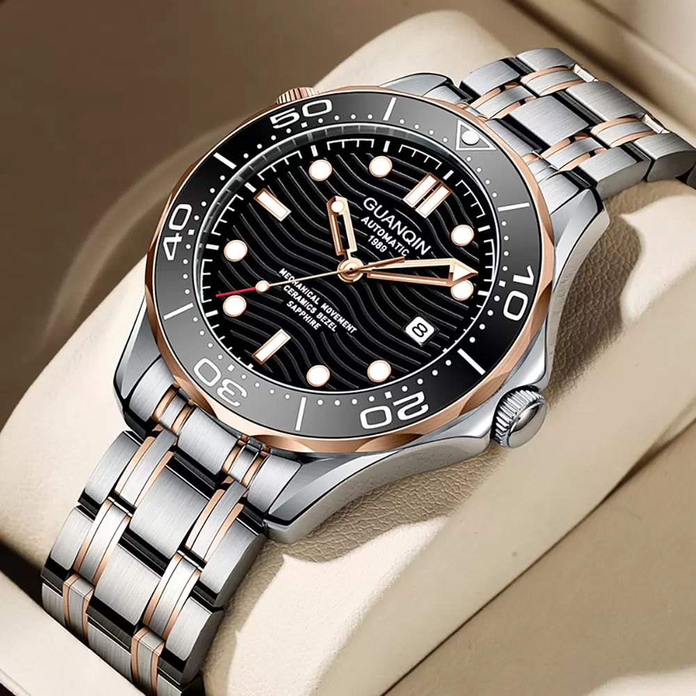 Elevate your style with the GUANQIN Diver Automatic Watch! Featuring a black wave-pattern dial and classic two-tone stainless steel strap, with a unidirectional rotating bezel and date window, delivering a tough sporty vibe.