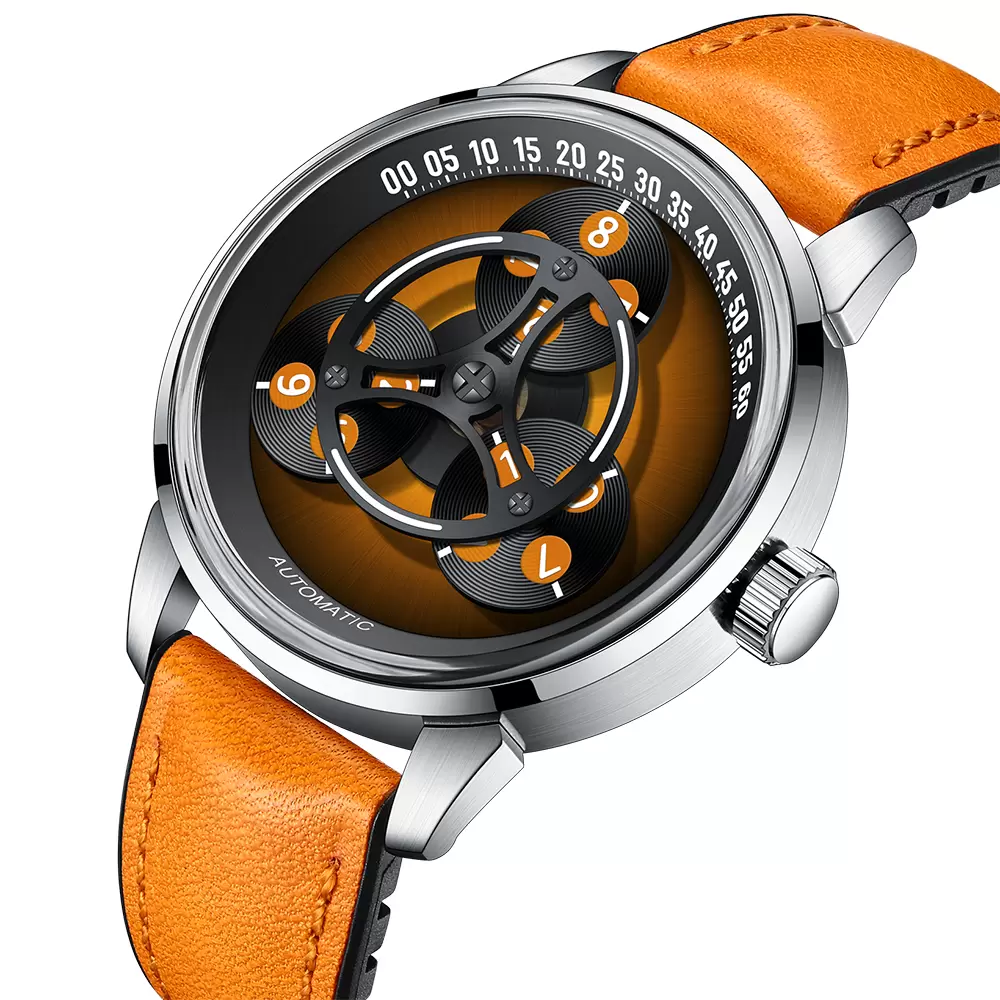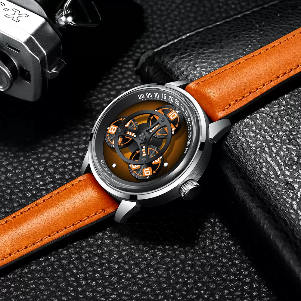 Redefine time-telling with this creative triple-axis jumping hour watch! The orange-black dial with rolling digital markers delivers a futuristic tech vibe, paired with a vintage brown leather strap perfect for trendy and daily wear.