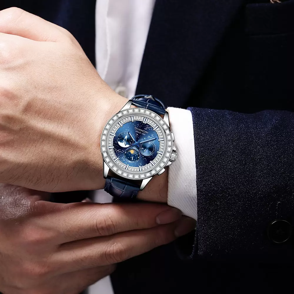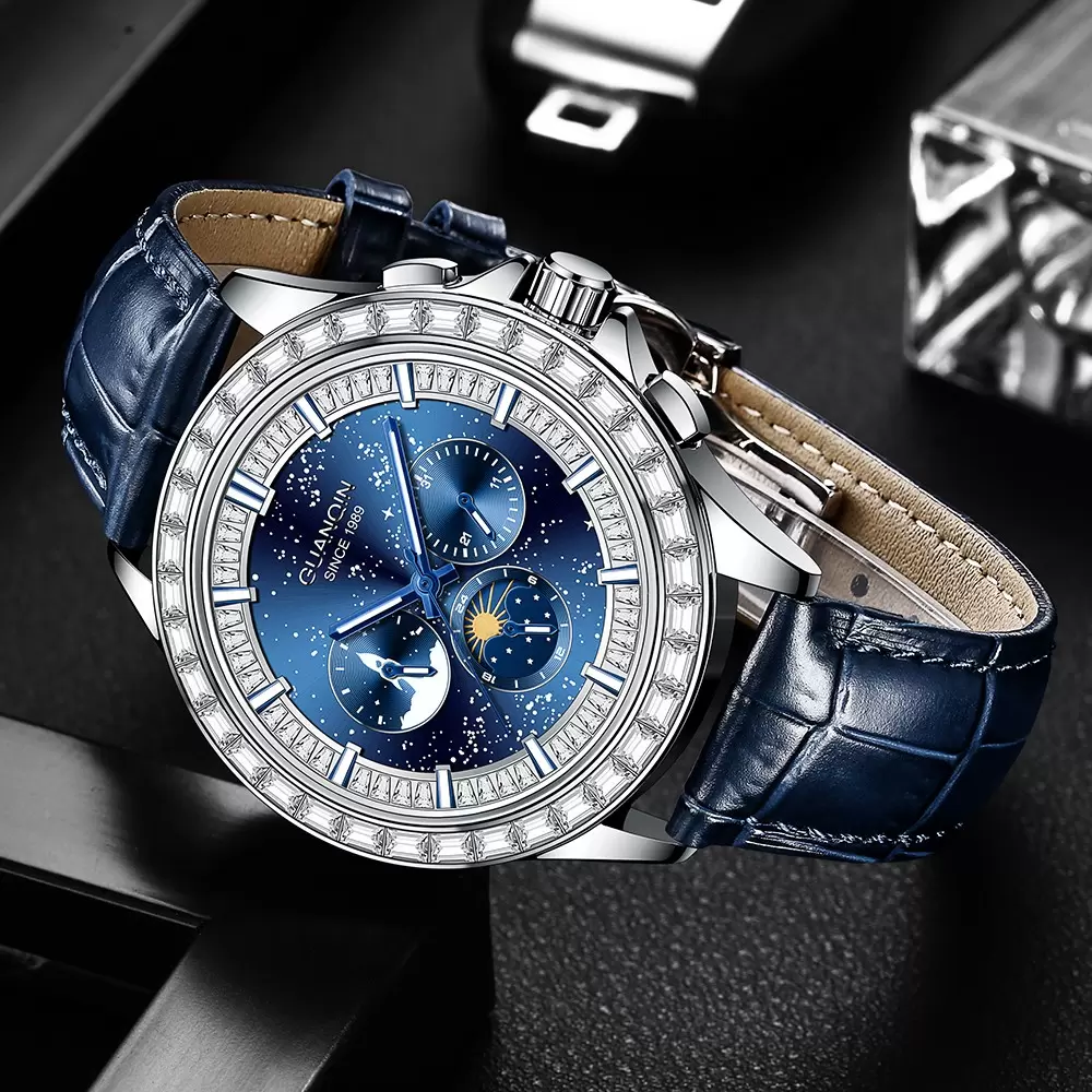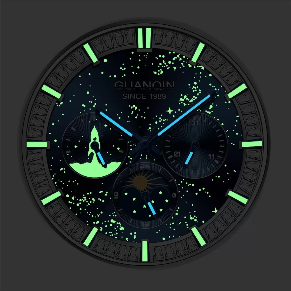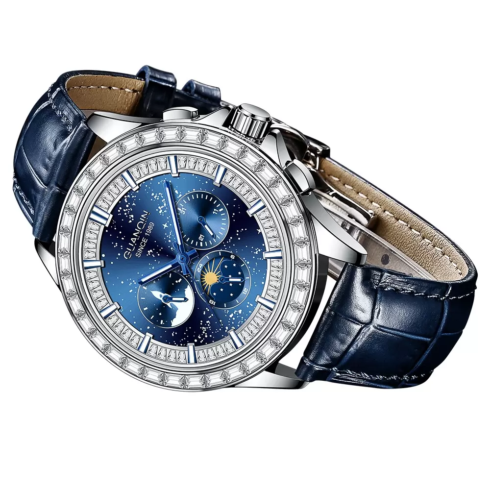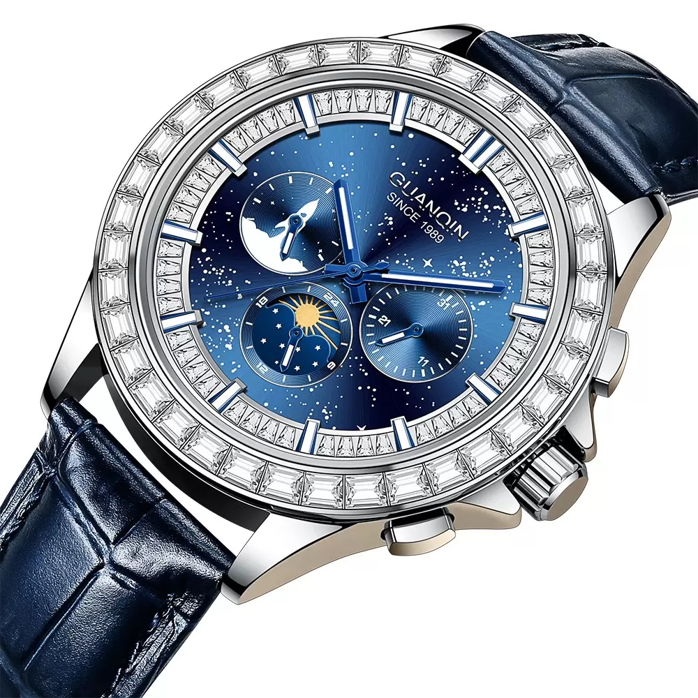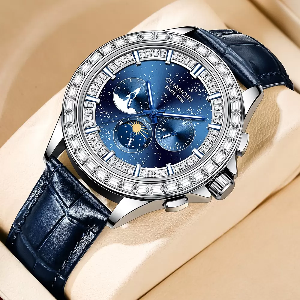 Elevate your style with the iconic GUANQIN 1989 Starry Sky Series watch! The deep galaxy dial features rocket chronograph, moon phase function, and a sparkling baguette diamond bezel, paired with a premium blue leather strap for business and casual wear.